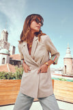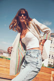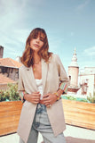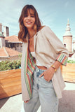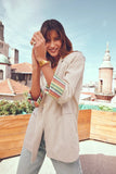 Giyi blazer, tailored in linen and cotton blend is a timeless, utilitarian and comfortable piece. It has striped details and lining in handwoven fabric from Tokat, Anatolia. Cuffs can be turned up or worn down.