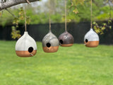 * 4.5” diameter x 5.5” tall * 1.5” opening keeps predatory birds from nesting * wheel thrown by real humans in our Indianapolis studio * glazed to order - please allow 1-3 weeks for shipping * add a small twig from your yard under the opening to make it easy for the birds to perch * drainage hole in the bottom * natural jute twine for hanging (We recommend replacing this yearly for security) * each bird house is unique * we strongly recommend hanging the darker glaze bird houses in the shade so it doesn’t become too hot inside * at the end of the season, remove the nest and take the birdhouse indoors to winter and put it back out in the spring and it will last a lifetime