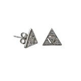 These unique geometric studs are simple, sophisticated, and edgy. Made of sterling silver and rhodium plated. Set with high quality round cut micro pave' set cubic zirconia. Earrings measure 10mm. Center posts with butterfly backs for pierced ears.