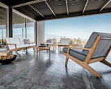 Designed by Danish designer Henrik Pedersen, the Bay collection offers a unique look with its teak frame and sling back panel. Thick cushions and a reclined frame gives one the feeling of sitting by the Bay.